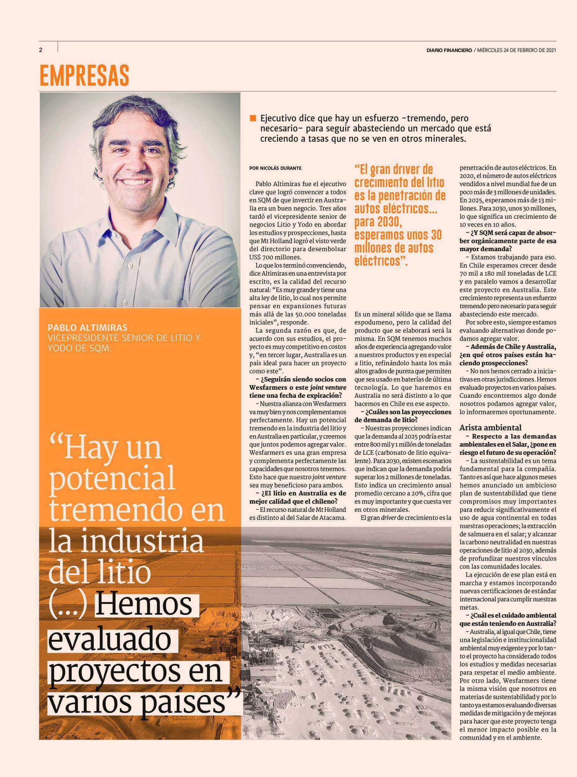 Sustainability is a fundamental issue for the company. So much so that a few months ago we announced an ambitious sustainability plan that has very important commitments to significantly reduce the use of inland water in all our operations; brine extraction in the salar; and to achieve carbon neutrality in our lithium operations by 2030, in addition to deepening our ties with local communities. The implementation of this plan is underway and we are incorporating new international standard certifications to meet our goals.